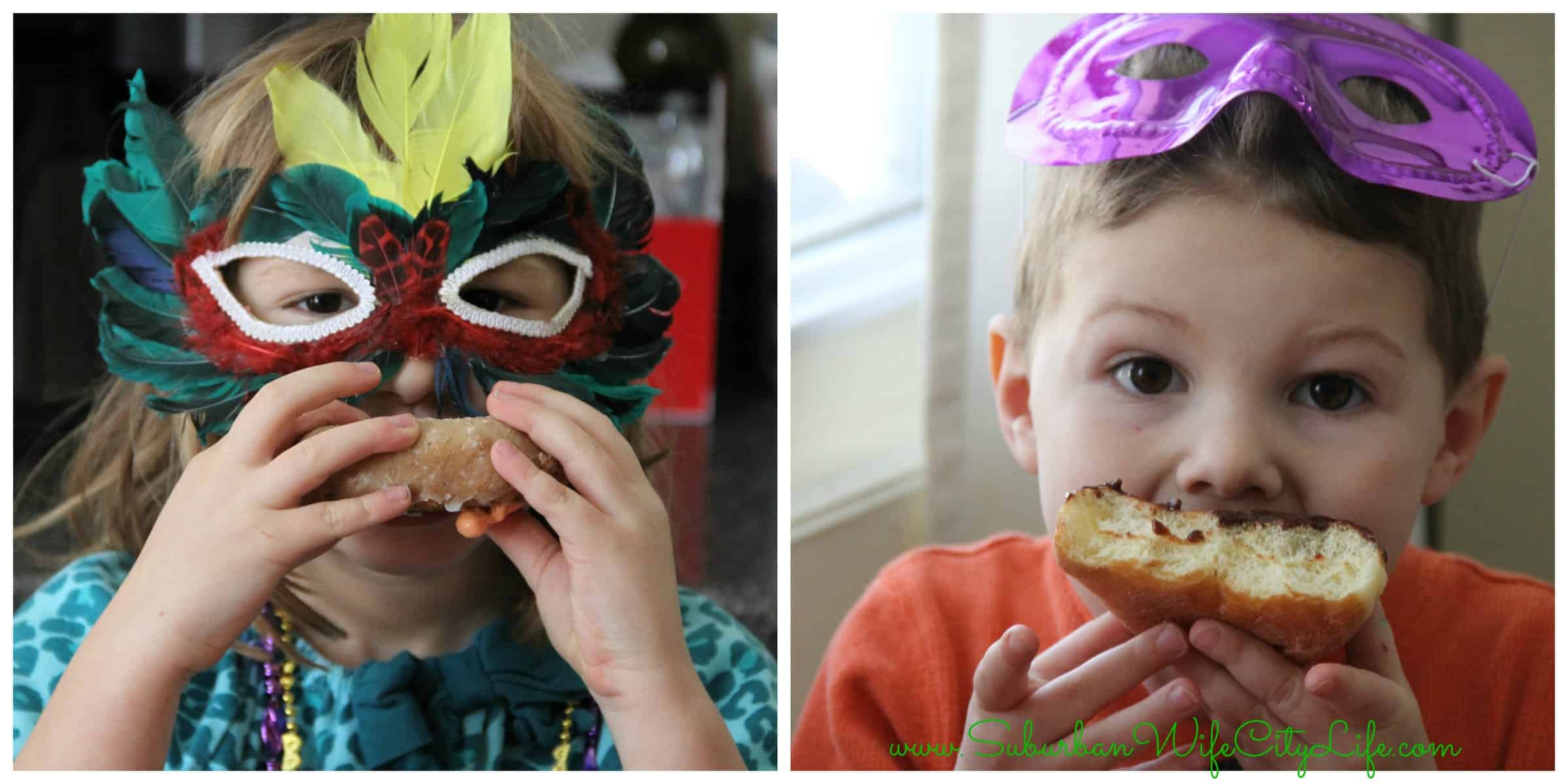 What makes this so much fun is how easy it is. We got some beads, masks and party horns for style and tiny babies to hide in our king cake (AKA donuts). Part of the tradition is whoever finds the baby will keep the festivities going for the coming year.