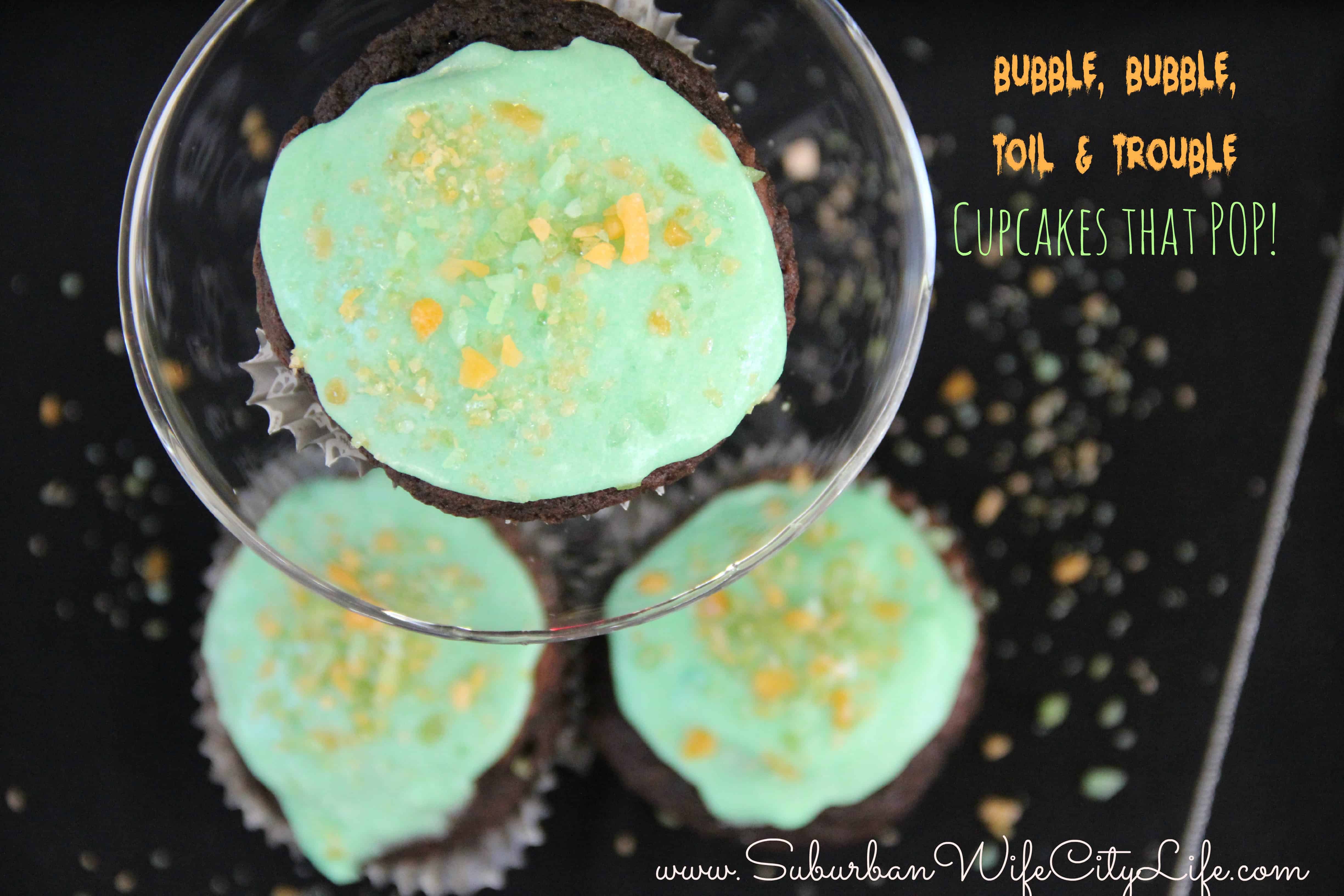 It’s Halloween and if you’re family is anything like mine we’re planning our costumes, school parties, playdates. pumpkin and apple picking and getting our house ready for the winter. What’s my point? Well time is of the essence and not everyone can pull together pinterest perfect cupcakes, but I’ve got some that will make the kids giggle and are super simple. A cute name, Bubble, Bubble, Toil and Trouble cupcakes with Pop Rocks!