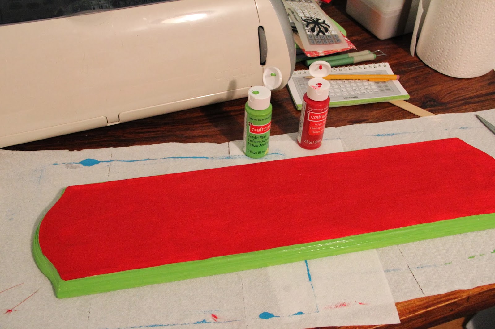 I bought my piece of wood from Michaels (don’t forget to find a coupon if it’s not on sale) and looked through my paint to see what colors I had available.  I chose a lime green and holiday red.